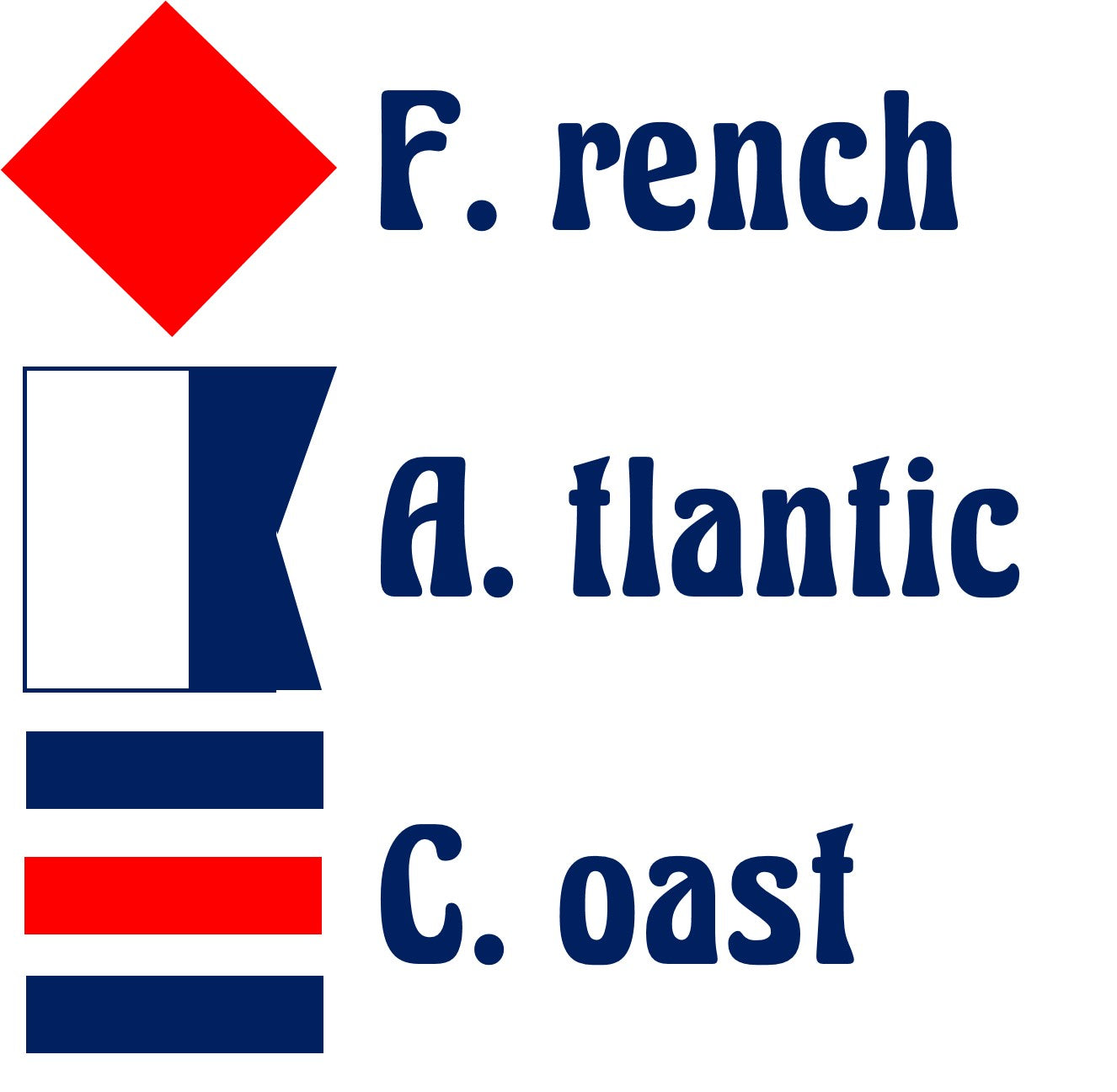 Tous les vêtements sont arborés de 3 pavillons reconstituant la marque French Atlantic Coast. Selon les vêtements vous les retrouverez sérigraphiés (t-shirt et sweat-shirt) ou brodés (polos vestes, manteaux, bermudas, sweat-shirt zippés).